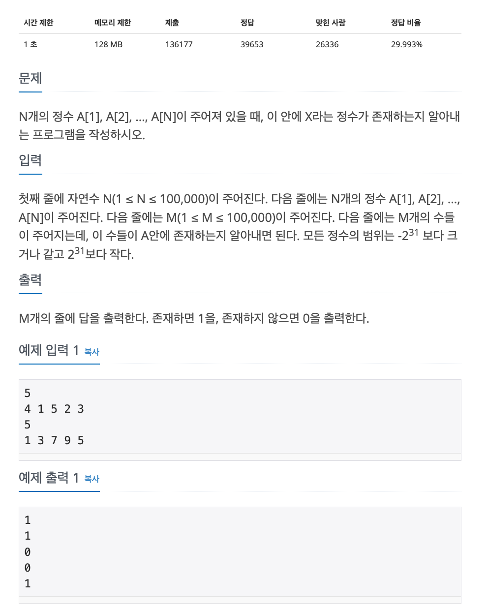 >>>N개의 숫자들의 순서는 상관없고, 포함 여부만 확인(M은 순서 상관 있음)